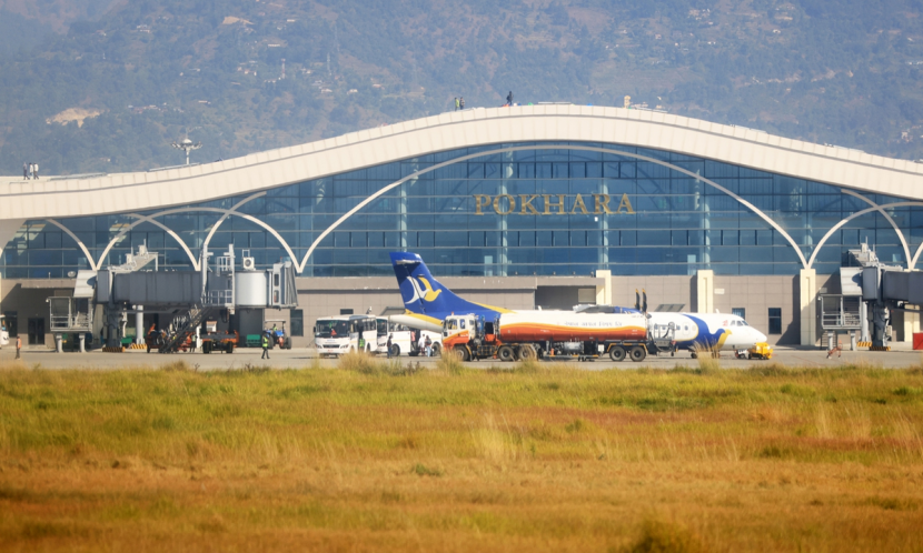 A plane lands at the Pokhara International Airport constructed by a Chinese company in Pokhara, Nepal. Photo: VCG